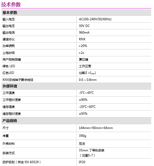 符合欧洲安全标准和KNX标准协议。可为KNX/EIB总线系统提供最大960mA电流。